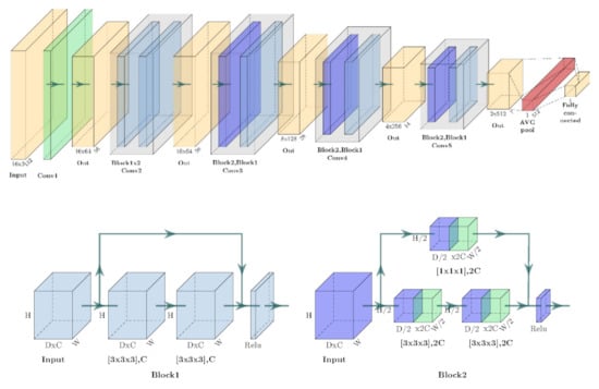 The architecture of the network is based on 3D ResNet-18, whose capability in terms of video recognition has been proven in [,]. The structure is illustrated in Figure 2. The size of the input frame stack and the feature map is notated as , where is the number of the channels, is the depth of the input (the number of frames in the time window for this case), is the height of the frame, and is the width of the frame. The convolutional kernel size is denoted as , where is the depth of the kernel and is the spatial size of the kernel. The size of the cropped video clips for both feeds is pixels, which is resized to pixels and then randomly cropped to pixels. A total of 16 frames in a clip are used as an input of the network for training, which can be denoted as. A total of 5 groups of the convolutional layer are used in the network. The size of the convolutional kernel and the extracted feature map from each layer are presented in Figure 2. There are 2 types of residual blocks used in the last 4 convolution layer groups, which are shown at the bottom of Figure 2. The shortcut structure of each block can be expressed as: