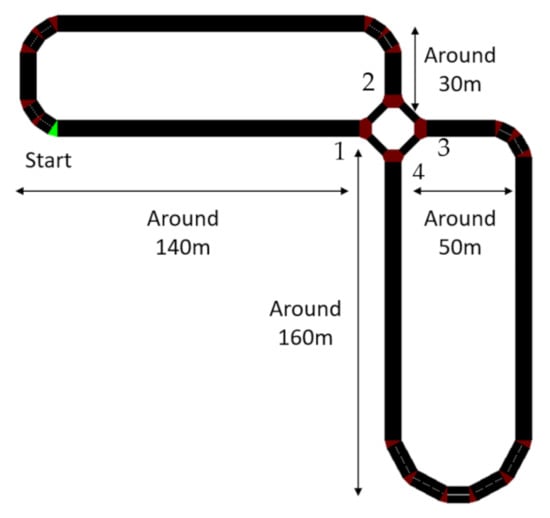Track and take-over scenarios: The testing track is a two-lane road with a mini roundabout, as shown in Figure 4. The start point is highlighted with green colour. In the odd loop, the vehicle enters from 1 into the roundabout and leaves from 3. Then, it enters from 4 and leaves from 2. In the even loop, the vehicle enters from 1 and leaves the roundabout from 4. Then, it enters the roundabout from 3 and leaves from 2. The TOR signal was issued at specific points on the track to avoid the area around the roundabout for safety concerns. The lateral offset was set as 1.5 m with a small variation in the real trials. The maximum speed of the vehicle was set as 30 mph. The interval between TORs was randomly selected from the range of 5–9 min.