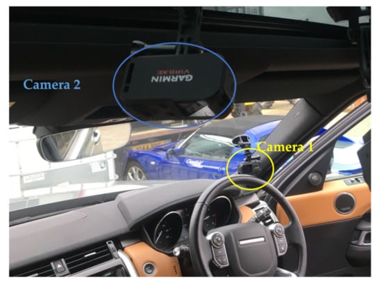 Video acquisition and dataset pre-processing: 2 Garmin Virb Action Cameras were used to capture the driver’s behaviour inside the vehicle cabin in this experiment. Both cameras had a spatial resolution set at pixels and a temporal resolution set at 30 frames per second (fps). As shown in Figure 5, Camera 1 extracts the driver’s head movement and facial information and detects if the driver is checking the road or engaging with NDAs. Camera 2 captures the driver’s hand movement when interacting with the tablet or the primary steering wheel, which was mounted on the vehicle’s roof between two front seats.