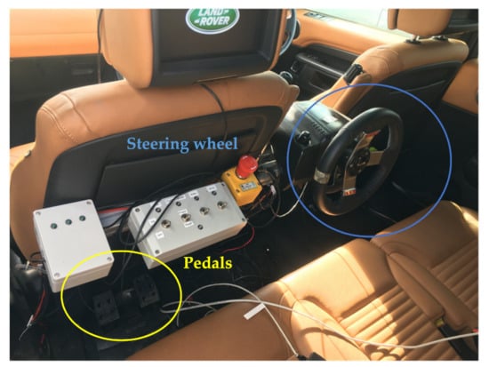 Vehicle Modification: An instrumented Land Rover Discovery 5 was employed as the testing bed, which was modified to accommodate both autonomous and human driving. An electric motor, operating on the steering column, was used for steering and another electric motor was used to control the throttle pedal position. Braking was modified using a pneumatic actuator on the brake pedal. To ensure safety, a second steering wheel and a set of pedals were added in the back seat, shown in Figure 6, which allows a safety driver to intervene and override the autonomous system. For the path following, the pure pursuit algorithm was used to generate the reference steering angle. The rear steering wheel was controlled using the reference steering angles and the front wheel follows the rear wheel.