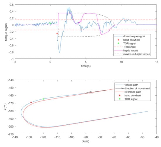 A certain torque threshold was applied for hand-on-wheel time () detection. It was experimentally determined to avoid false take-over detection due to sensor noise. An instance of the driver’s torque during a take-over process is shown in the top plot of Figure 7. The corresponding vehicle route is presented in the bottom plot of Figure 7.
