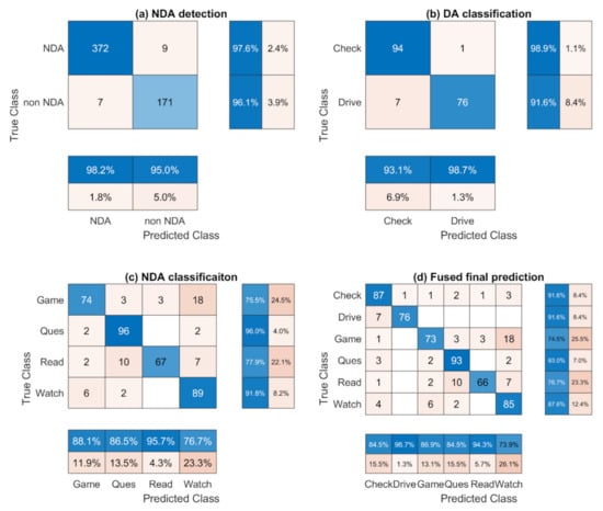The confusion matrices of the proposed two-feeds 3D CNN models are presented in Figure 8. All six activities are abridged as a term for the convenience of result presentation. Check and Drive refer to two DAs, which are road checking and driving. Game, Ques, Read, and Watch refer to the four kinds of NDA, which are playing games, answering questionnaires, reading news, and watching videos, respectively. For the NDA detection based on the driver’s head movement (Figure 8a), the precision and recall of both classes are over 95%. The accuracy of the NDA detection is 97.14%, as shown in Table 1. The DA classification (Figure 8b) also shows a high precision and recall (>90%) and the accuracy is 95.51% (Table 1). A total of 8.4% driving instances were misclassified as road checking, which is due to the hand gesture where sometimes the driver holds the tablet in one hand and controls the steering wheel with another hand during the take-over process. As shown in the confusion matrix for NDA classification (Figure 8c), among all these NDAs, answering questionnaires achieves the best performance (86.5% for precision and 96.0% for recall). The lowest recall value is from playing games, which is 75.5%. The main contribution of the false negative is from watching videos, which is due to the limited hand movement in some game engagement instances, and comparing with the other two NDAs, watching videos has similar spatial information with playing games. The highest value of precision is from reading news (95.7%), while the recall is only 77.9%. Answering questionnaires and watching videos are the main contributions of the false negative. The prediction of reading news could be tricky, because sometimes the limited hand gesture change could lead to confusion with watching videos. Sometimes, the frequent movement required for turning pages could be misclassified as answering questionnaires since the spatial background could be similar between these two classes. From the final fusion matrix, shown in Figure 8d, it can be observed that the driving class achieves high values in both precision and recall. Since the results are obtained by combining the 3 models, the value of each class shows a similar trend with the value in the separate model mentioned above. The total accuracy of the final prediction is 85.87%.
