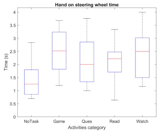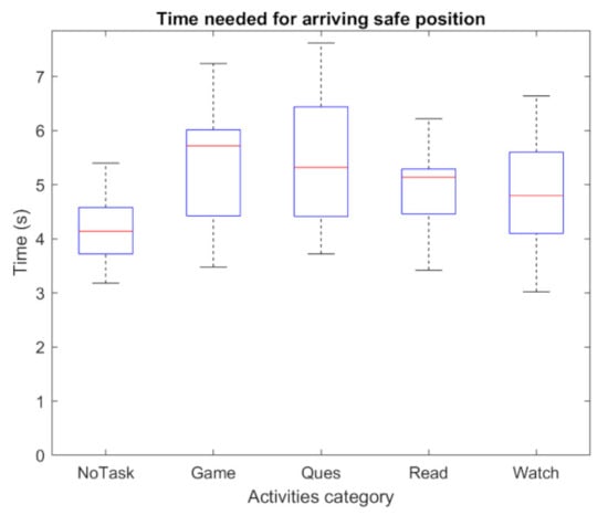 The take-over performance is presented and evaluated in this section. Figure 9 shows the driver’s hand-on-wheel time () against five activities. The shortest mean value of is around 1.3 s, which is NoTask. For the remaining four NDAs, the average value is in the range of 1.9–2.6 s. Answering questionnaires shows a relatively shorter than other NDAs. The maximum lateral error is presented in Figure 10. It can be observed that the value for each NDA and NoTask are similar, the average value is around 2.8 m. In the experiment, the TOR signal was given after the lateral error achieved 1.5 m, while most of the drivers could control the vehicle within a maximum 3.5 m lateral error. However, the impact of the NDAs engagement on the take-over performance mainly presented after the maximum lateral error was achieved. From Figure 11, the baseline of time needed to achieve the safe position () is around 4.16 s for NoTask. The for NDAs engagement is at least 0.5 s more, which suggests the engagement of NDAs could increase the time that the vehicle stays in the dangerous position on the road. The mean and standard deviation of for each activity are presented in Table 3. For the passive NDAs, the mean values of watching videos and reading news, as the passive NDAs, are 4.74 s and 4.96 s respectively, which are higher than the active NDAs, answering questionnaires and playing games (5.45 s and 5.43 s respectively). The standard deviation of the NDAs is higher than the NoTask, which suggests higher individual differences in terms of take-over performance in NDAs engagement. From Figure 9 and Figure 11, it can be observed that the driver under active NDAs engagement requests more time to drive the vehicle back to the safe position, which suggests a higher mental demand or workload during such NDAs engagement. After receiving the TOR signal, the driver needs more time to build awareness of the surrounding environment and it is more challenging for them to switch to the take-over process from the NDA engagement.