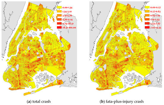 The crash data set was collected from the NYC Police Department (NYPD). Every row in this set represents a crash record, containing its occurring date, time, geographical coordinates, involved vehicle types, the number of people being injured or killed. During the three years, a total of 237,443 crashes were recorded, including 48,390 injuries and fatal crashes. In this study, we calculated the crash rates of total crashes and fatal-plus-injury crashes as the dependent variables. Figure 2 shows the spatial distribution of these two types of crash rates crossing different CTs. As observed, from the total crash rate perspective, the crash rates are concentrated in the southeast areas. While the fatal-plus-injury crash rates are randomly distributed over the entire city.