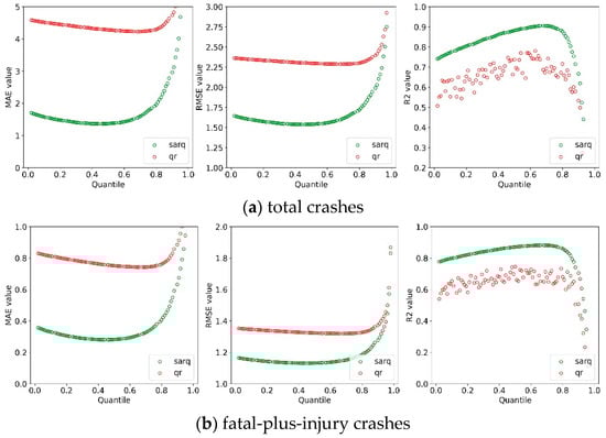 Three common measures, i.e., mean absolute error (MAE), root mean square error (RMSE), and R-squared (R2), were used to evaluate the model performance of QR and SARQ models. The lower the values of RMSE and MAE are, the predicted accuracy of the corresponding models are [30]. In addition, models with a higher value of R2 towards 1 fit better to the data. To obtain the predicted accuracy of the two models crossing the entire distribution of crash rates, we set the quantile value to q = 0.02, 0.03, …, 0.97, 0.98. The comparison results relating to total and fatal-plus-injury crash rates are shown in Figure 3. As observed in Figure 3a, the MAE and RMSE values at each quantile of the SARQ model were much lower than that of the basic QR model and the R2 value of the SARQ model at each quantile was also greater than that of the QR model, indicating that the SARQ model outperforms the QR model in data fitness and prediction accuracy. The results are not unnormal, as the SARQ model defines the spatial autocorrelation using a specific spatial structure and considers more influences of unobserved factors. The sub-figure showed that the two quantile-based models perform best at the non-central location (i.e., 50th quantile), which reveals the necessity of using the quantile regression models to handle the outliers and skewed distribution of crash rate. More importantly, we could observe how the three measures vary with quantiles, specifically, the MAE and RMSE figures present a U-shape across the entire distribution of total crash rates, while the figure of R2 exhibits the negative U-shape crossing the distribution. The results show that when the quantile value move from the low tail to the high tail, the model performance improve and reach the optimal point, and then decrease during the rest of the distribution. The U-shape not only indicates how the modelling location affects the model performance but also provides the best modelling location. The results of the fatal-plus-injury crash rate reveal similar findings, as shown in Figure 3b.