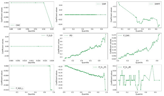 However, there are different patterns of coefficients related to CWF, ELD_P, and P_SL_45. The estimated distribution of parameters of P_SL_45 exhibited a U-shape. Specifically, when the quantile value changes from the low tail to the high tail, the figure decreases and reaches the lowest point, and then rose during the rest of the distribution. Notably, the signs of these parameters do not change across the 97 quantiles.