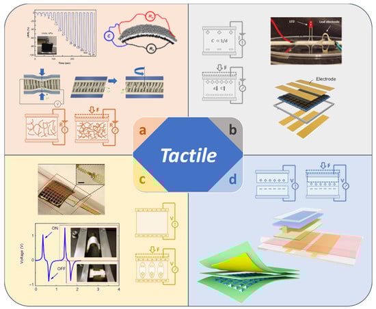 Fourthly, the triboelectric effect is a type of contact electrification that occurs when a particular material is charged, after being separated from the surface of another material (Figure 1d) [44,45]. The basic operating mechanism is described as a charge in which a potential difference periodically occurs on the inner surfaces of two sheets with opposite directional triboelectric charges [46]. Charges are transferred by contact with these surfaces, leaving one as the anode, and the other as the cathode. When separated from the outside, an electric field is generated, and an output voltage is generated by the tactile device [47]. The working mechanism is as follows: