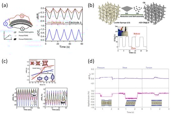In recent years, piezoresistive devices have been developed based on various materials and device structures to detect changes of stimulus from the outside (Table 1). Previous studies have focused on generating signals according to changes in the energy band of semiconductors [49]. However, in recent years, studies of the application of new composite materials between conductive materials and insulating matrices have also been conducted. Peng et al. reported a device that included three stacks of porous polydimethylsiloxane (PDMS)/silver nanowire (AgNWs), PDMS/PDMS, and carbon nanofibers (CNFs) (Figure 2a) [50]. The sensor showed the ability to have high stretchable and capable of determining three forces simultaneously, namely normal pressure, lateral stretch, and transverse shear force. Due to the elasticity of PDMS and the conductivity via the conductivity of AgNWs and CNFs, it responded well to the changes in resistance while maintaining the strain.