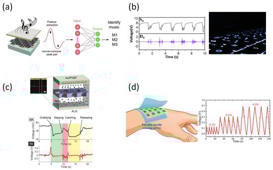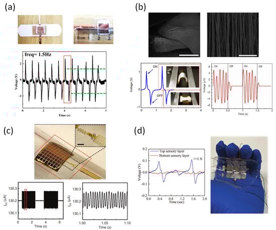 (a) Electrospun BaTiO3/Poly(vinylidene fluoride) nanocomposite membrane [89]. (b) Aligned arrays of nanofibers of poly(vinylidenefluoride-co-trifluoroethylene) for piezoelectric [90]. (c) Conformable amplified lead zirconate titanate (PZT) sensor [91]. (d) Crosstalk electrodes for spatiotemporally distinguishing diverse stimuli [92].