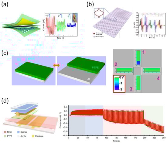 (a) Waterproof and stretchable triboelectric tactile sensor [108]. (b) Silver-coated nylon yarn on silicone rubber for skin-inspired triboelectric [109]. (c) Single-electrode based sliding triboelectric for vector sensor [110]. (d) Sliding mode triboelectric by charge space-accumulation effect [111].
