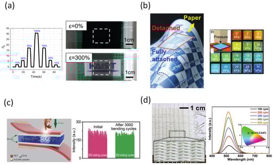 (a) Optical tactile device builds based on CNTs embedded in Ecoflex film [131]. (b) Adaptable and wearable photonic sensor based on shape-memory/responsive cellulose [132]. (c) Pressure mapping of personal handwriting device based on chemiluminescence [133]. (d) Self-power light-emitting fabric [134].