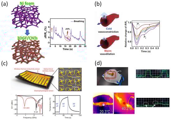 With the development of 3D printing technology, it can be used today both with polymers and with composite materials to create very complex structures. Cao et al. used a 3D printer to develop an ultralight 3D hybrid piezoresistive sensor that was inspired by the loofah sponge and reduced graphene oxide (Figure 2b) [51]. Carbon black (CB) was introduced to optimize the conductivity of the reduced graphene oxide while enhancing the sensitivity of the multifunctional hybrid. The device is very small in size, but has high conductivity, short recovery time, excellent stability, and low manufacturing cost. Since traditional foam can provide excellent properties for piezoresistivity, the effect of the tunable Poisson ratio foam material on the piezoresistive effect was also investigated by Li et al. (Figure 2c) [52]. The negative Poisson’s ratio of the substrate significantly improves working performance in all three dimensions. Compared to the typical foam-based sensor, the auxiliary foam can both be extended laterally by an external force, and offer unique advantages to stretchable sensors and devices. These working conditions make the equipment more comfortable to accommodate the change of shape of a flexible area of the body.