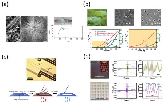 The fast response time of the piezoelectricity sensor allows rapid collection of pressure information, and shows the possibility of application to artificial intelligence applications. Boutry et al. demonstrated a device that was capable of measuring and distinguishing both shear and pressing forces in real-time using a hierarchical pattern (Figure 3d) [76]. The structure of the sensor was created using the hierarchical structure of the sunflower to optimize the performance of the piezoelectric. Therefore, this sensor system not only detects small changes in the motion of the robot arm, but also suggests the possibility of controlling it for various purposes in the future [77].