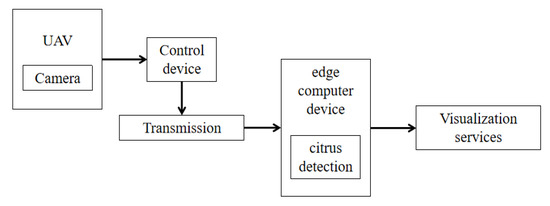 UAV capture image has high security and flexibility. The change of environment has little impact on its image acquisition, and the image acquisition cycle is also short, which improves work efficiency and reduces the labor cost. Figure 2 depicts the process of capturing citrus images using UAV. First, we used the camera carried on the UAV to capture the citrus image, transmit it to the edge computing device through the wireless network. Then, we used the deployed target detection algorithm to detect the citrus and visualize it through the display device.