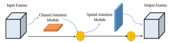 The insertion of CBAM in the model structure is shown in Figure 6, and we added CBAM to the feature pyramid before each extracted feature fusion to improve the model performance.