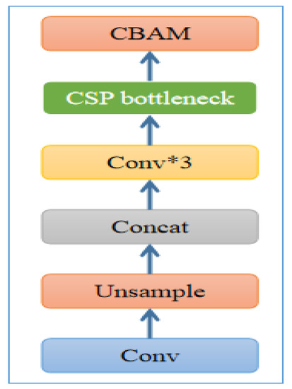 The CBAM model was added to each basic block, which integrates the output features immediately after the CSP bottleneck. Among them, Conv * 3 means that three convolution layers are superimposed together.