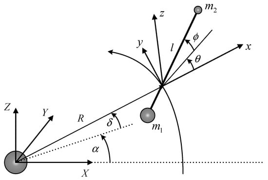 Since the 1990s, TSS theory has developed rapidly from rigid-rod models to bead models and from continuous models to discrete models, and model accuracy is constantly improving [30,31]. However, other models’ dynamics equations are more complex and the quantity of computation is larger when compared with rigid-rod models [32]. The classical rigid-rod model is widely used. As shown in Figure 1, a rigid tethered satellite system consists of a mother satellite, , and a subsatellite, , (mass points), respectively. Both satellites are connected by a rigid tether. In this model, regardless of tether flexibility and tether elasticity, tethers released into outer space are considered as straight rods of infinite stiffness that do not bend or twist. Tether wounds on a spool of a deployment device in the mother satellite and tether length can be effectively controlled by the device.