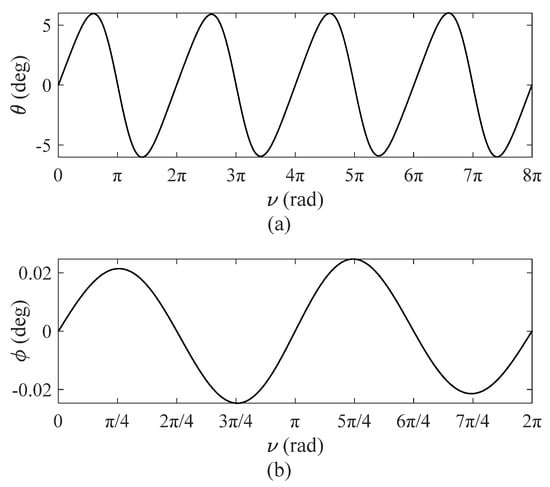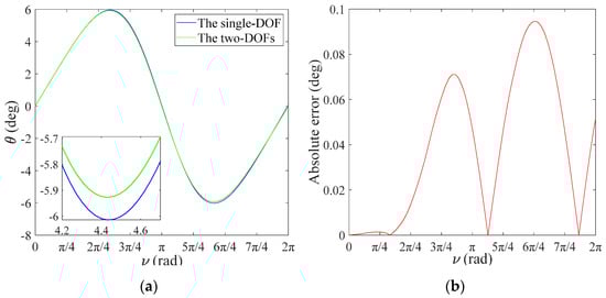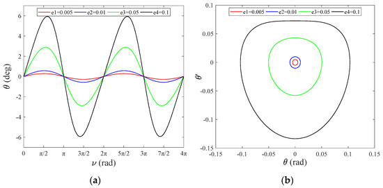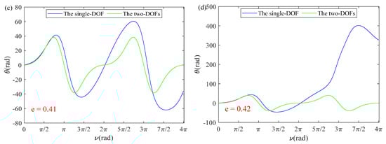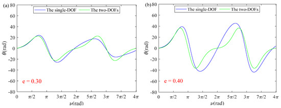 In order to further verify the accuracy of the single-DOF simplified model, different orbital eccentricity values are substituted into Equations (24) and (25). Both curves almost coincide in Figure 4a, and the maximum error of the in-plane vibration angle is with in Figure 4b, which illustrates that coupling effects of the out-of-plane vibration angle are negligible. In particular, the solution of the single-DOF with the first five orders demonstrates sufficient accuracy in Equation (23), which proves that the error of the perturbation method is negligible. However, as shown in Figure 5, it can be easily observed that the error of the single-DOF simplified model increases as orbital eccentricity increases. In Figure 5, the error of the single-DOF simplified model was significantly smaller when value decreased from 0.42 to 0.1, which means that a single DOF-simplified model can be applied to orbits with low orbital eccentricity so that accuracy can be guaranteed.