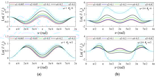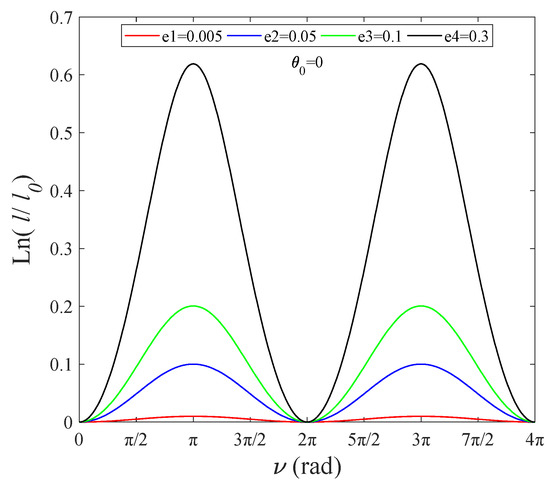 Figure 6 shows that Equation (27) achieves a unified analytic solution when (k is an integer). Tether length is positively related to orbital eccentricity, and the abscissa corresponding to the highest point is .