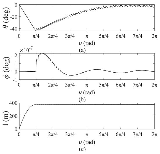 Figure 8 shows the dynamic response of the TSS deployment process. Figure 8a,b show variations of in-plane and out-of-plane pitch angles and roll angles versus the true anomaly, . It can be concluded that the system approaches the expected angle, 0 rad, after swinging under an initial perturbation. This result illustrates that a controlled deployment process is asymptotically stable and demonstrates the validity of the tether tension control equation (Equation (29)). Figure 8c shows tether length during deployment, which exhibits a smooth deployment curve, and the tether eventually reaches a stable length.
