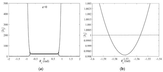 Figure 9a shows the relationship between Floquet multipliers and stability of expected in-plane angles for , where the case of is discussed. As shown in Figure 9b, this result shows that Floquet multipliers are less than one for by symmetry, which illustrates that deployment in a short interval of is asymptotically stable. However, once lies outside the specified range, Floquet multipliers are always greater than one, which shows that the deployment process is undetermined since the expected in-plane angle lies outside the domain of stability. A similar result is achieved with .