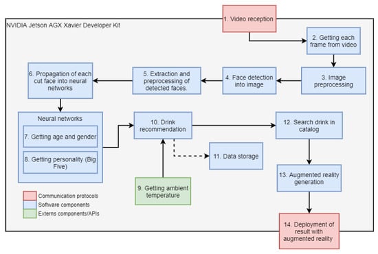 The proposed system is composed of deep neural networks that analyze independent characteristics of the user by means of their face (age, gender, and personality), in addition to obtaining the ambient temperature, to be able to be entered into a drinks recommender system and display the recommendation obtained through a module that adds augmented reality to a screen.