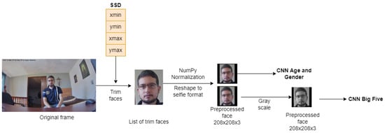 For this step, a model previously built and developed from facial analysis in images will be taken, since these provide better results than all types of existing multimedia files (audio, text, video, and images) [], being the model of classification: CNN-4 of the work in [,] the one selected to be integrated into the system, because despite the fact that there is a better model obtained in the same work called FaceNet-1 [], its weight, computational requirement, and convergence time is very high, causing the selected hardware devices not to be able to support it, taking then the second best model of the work, whose precision obtained does not differ significantly from this, and in return offers better performance and speed. In Table 4 and Table 5, a comparison of the precision in the detection of personality by Big Five is made between the various models of [] from the images of faces, which have the following characteristics: They are in a selfie format, they are in grayscale, normalized, and their resolution is 208 × 208.
