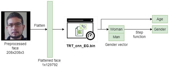 Diagram showing the flattened input face, the age, and gender network model in TensorRT, and its two outputs: The age obtained from the regressor, and the gender vector obtained from the classifier.