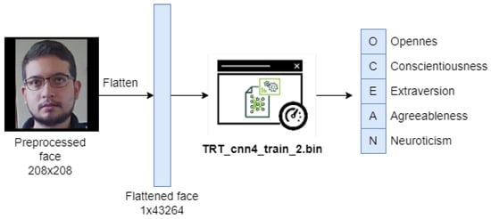 Diagram showing the flattened input face, the classification model: CNN-4 [] of the Big Five network in TensorRT, and the output vector of size 5 where each position corresponds to a personality dimension as indicated.