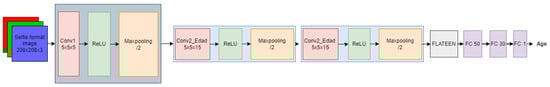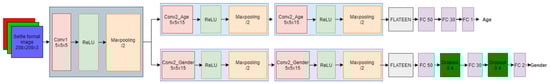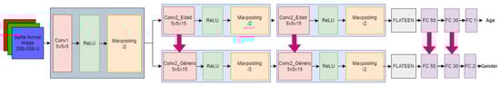 To obtain age and gender from an image of a person’s face in selfie form, a multitasking convolutional neural network is designed with the intention of reducing the amount of computational resources to be used. We start with the layers estimating age, which is the first part of the design. The architecture of this network is shown in Figure 6 and its hyper-parameters in Table 2.
