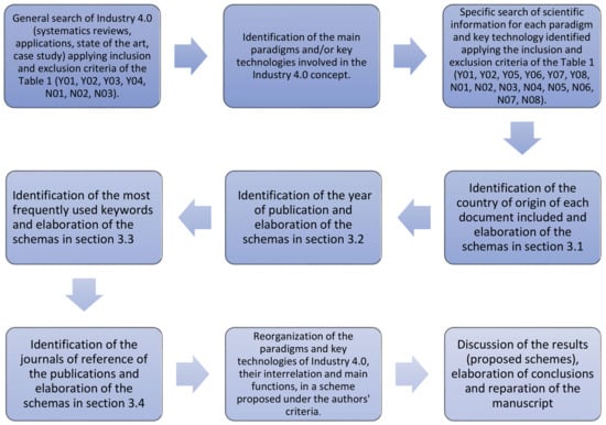 The research strategy started with an initial search in the aforementioned databases for scientific information with the following terms or keywords: “Industry 4.0”, “Smart factory”, “Fourth industrial Revolution”, “I4.0” and “Connected Industry 4.0”. The results of this first search allowed us to understand in a general way the concept of Industry 4.0, the studies that were developed on this topic and specifically to identify the main key technologies and paradigms involved in the Fourth Industrial Revolution. The inclusion/exclusion criteria from Table 1 applied were Y01, Y02, Y03, Y04, N01, N02, and N03. In addition, it is worth mentioning that no exclusions were applied due to the region, university or research center, and for this initial search, no restriction was applied with respect to the year of publication.