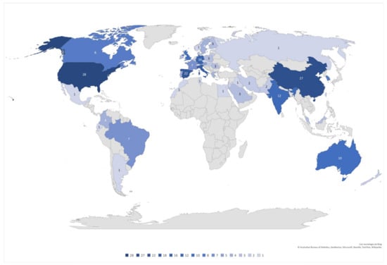 A map helps us to visualize geographically all the scientific contributions analyzed. It can be noticed that the United States and China are the countries that do the most research and contribute to this topic; in turn, we can suggest that they are the technologically, industrially, and economically dominant countries. It is shown in Figure 3.