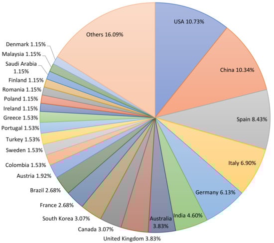 To find how much each country has contributed with its research to the elaboration of this study, each scientific paper was individualized, and its contribution was summed according to its authors and their affiliations. Each different affiliation per article was considered with a value of 1, represented as a percentage in Figure 4.