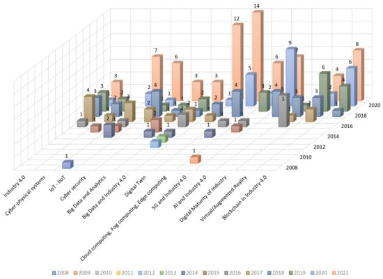 We cannot talk about specific technologies, as the concept allows a constant evolution and a continuous integration of new technologies as they mature or adapt, i.e., several emerging technologies are converging to provide more and more digital solutions to the industry, but we will mention the main ones, and their application in this case study []. According to the authors of the papers [,], they clearly mention the technologies involved in the concept of Industry 4.0. They also propose in the paper [] a conceptual framework, which they divide into front-end technologies and core technologies. The front-end technologies consider four dimensions (smart manufacturing, smart products, smart supply chain and smart work), while the base technologies consider four (Internet of Things, cloud services, big data and analytics). These works were of great help for our study, as they define a way to analyze the complex and multidisciplinary world of Industry 4.0; however, for our case, we will analyze in terms of paradigms with cyber–physical systems criteria. Our analysis proposal allowed us to clarify the concept and propose better roadmaps toward the fulfillment of each Industry 4.0 project objectives. Finally, the bibliometrics of the research is exposed in the most explicit and graphic way possible in order to not only deliver information to readers, but also as a motivation or inspiration for other researchers to have a vision of the opportunities presented by Industry 4.0 and digital transformation to see how world power countries invest in research in these areas and turn them into technological and economic leaders.