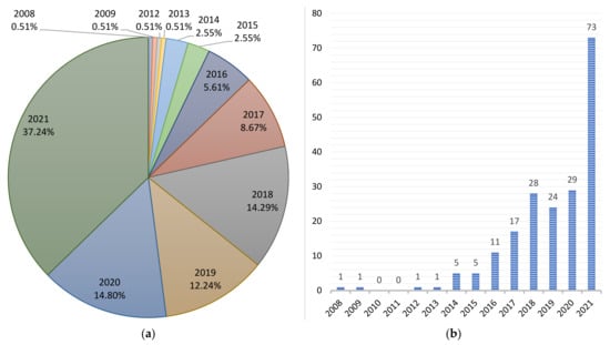 (a) Percentage ratio of scientific production by years; (b) distribution of scientific information by year.