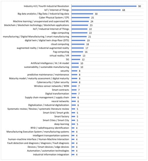 A total of 457 different keywords were identified throughout the reference literature. Keywords with the same or very similar definitions or concepts were grouped together to obtain a better analysis of the frequency of occurrence of technologies or concepts within the Industry 4.0 study. In some scientific documents, in which there was no keyword section, nor was this information part of the file metadata, the main words of the title were considered the keywords of the document. Figure 7 shows the 40 most frequently occurring words.