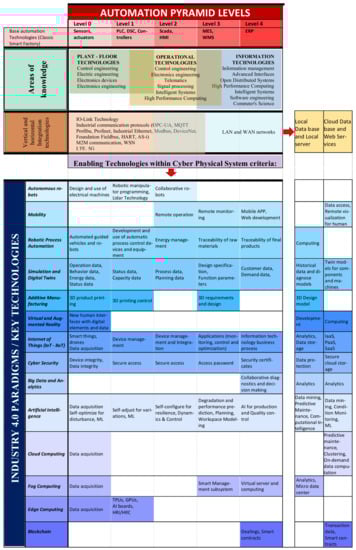 Finally, we reorganized the paradigms of Industry 4.0, according to the areas of knowledge, related to the automation pyramid, and the participation of information within this concept, general aspects of the cyber–physical systems criteria were placed and where each of them would be participating.
