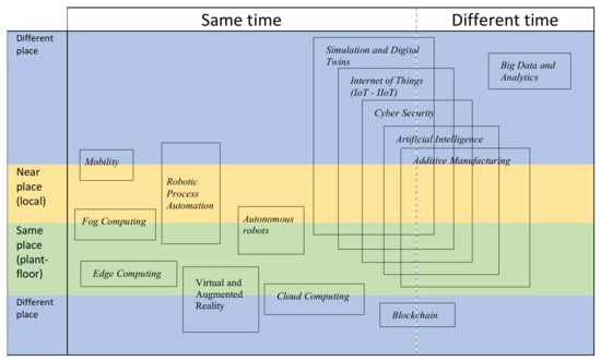 The purpose of this classification is to understand that these new concepts are not so much spatially or temporally located in a single quadrant, but that their scope goes beyond these classic boundaries and that they are collaborative and interdependent. For example, augmented reality interacts directly with the plant and machinery (same place) but requires high computational capacity and processing speed that is done with cloud computing (different place) all working in real time (same time), being a paradigm that is difficult to place in a classic automation pyramid or a classic CSCW matrix. However, there are also paradigms that can be placed in a single quadrant, as is the case of edge computing, which is characterized by performing computing and data storage in the location where it is needed (same place) to improve response times (same time) and save bandwidth.