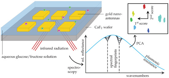 Incorporated into a reflective flow cell on top of a calcium fluoride () wafer are arrays of linear gold nanoantennas whose geometry was chosen such that their plasmonic resonance coincides with the characteristic molecular modes of glucose and fructose. Therefore, their enhanced vibrational fingerprint is encoded in the measured spectrum of the reflected infrared beam, which is schematically depicted in the lower right. Here, the blue curve represents the pure plasmonic resonance while the dips at the highlighted spectral fingerprints are caused by the presence of monosaccharide molecules [24]. Generally speaking, the larger these dips, the higher the concentration. In order to extract this critical pattern from the data and to quantify it, the authors perform a principle component analysis (PCA) [25], which, as shown in the top right corner, reveals distinct clusters for different concentrations of glucose and fructose in the aqueous solution. This does not only confirm that these two monosaccharides indeed have unique spectral fingerprints despite their similar chemical structure, but that SEIRA is specific enough to distinguish between them.