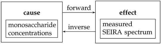 Flow chart visualising the forward/inverse problem of sensing with SEIRA spectroscopy of sugary solutions as an application example.