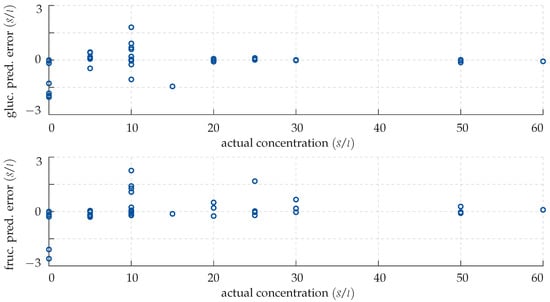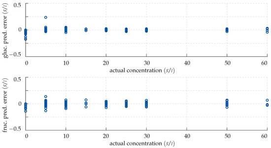 Analogously to Figure 8, the discrepancies in the estimated glucose and fructose levels are plotted over the actual concentrations in the training samples. In contrast to the predictions obtained by the neural network in Section 4.1, however, the GPR matches the actual sugar levels almost perfectly with a mean absolute deviation of 0.009 g/L (0.22%).