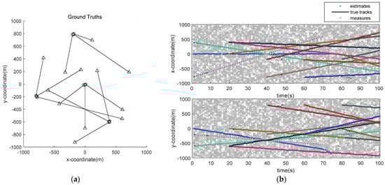 The tracking scene was set to multiple targets in four possible locations or spawned from other targets, and the observation area was [ 1 000 , 1000 ] × [ 1 000 , 1000 ] ( m 2 ) . There were 12 batches of targets in the scene. For the sake of simplicity, it was assumed that each target moves in a straight line at a uniform speed.