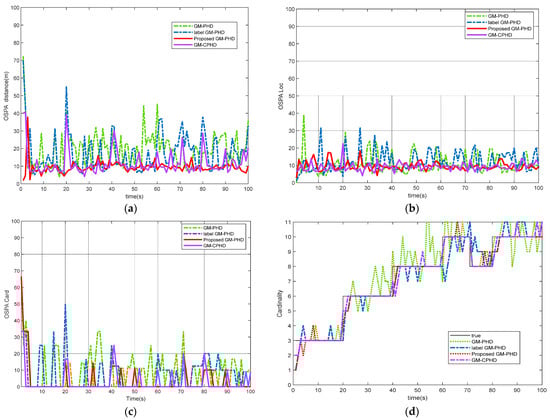In this MTT scene, clutter rate λ = 90 , survival probability p s , k = 0.99 , and detection probability p D , k = 0.8 . Figure 4 shows the tracking performance comparison of each filter in dense clutter and low detection probability environment. As can be seen from Figure 4, except for the improved label GM-PHD filtering algorithm, the tracking performance of other filtering algorithms is obviously degraded under the condition of low detection probability, which indirectly proves the robustness of the proposed algorithm. After pruning and merging, the Gaussian components are separated and clustered by using velocity and distance thresholds, which effectively improves the tracking performance of multi-targets under the environment of low detection probability.