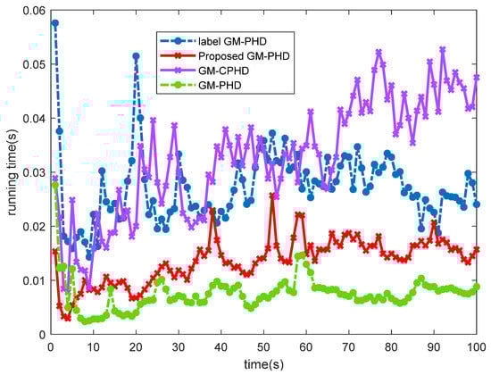 Figure 3 compares the running time of different filters in this scenario. It can be seen that the improved label GM-PHD filtering algorithm improves computational efficiency. Compared with the GM-PHD filtering algorithm, it has slightly higher computational complexity but compared with the other two filtering algorithms, it has higher computational efficiency because it uses label sets to combine Gaussian components with the same label, thus reducing the computational complexity. Figure 3 also shows that the improvement of GM-CPHD tracking performance is at the expense of computing time to some extent. Compared with the GM-PHD filter, the operation time of the improved label GM-PHD filter is still 13.14% higher than that of the GM-PHD filter, but the computational efficiency is improved by 11.23% compared with the traditional label GM-PHD filter.