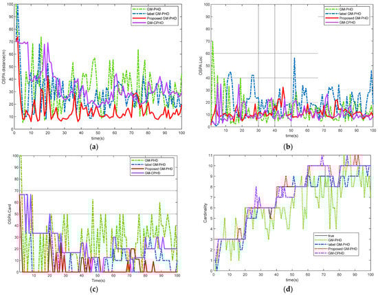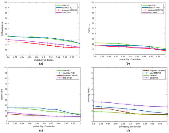 Figure 6. Comparison of the performance of different filters in a changing environment of detection probability: (a) OSPA distance comparison; (b) OSPA Location comparison; (c) target cardinalities estimation error; (d) running time comparison.