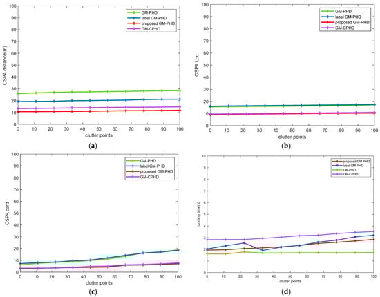 Figure 5. Comparison of the performance of different filters in a changing environment of clutter rate: (a) OSPA distance comparison; (b) OSPA Location comparison; (c) target cardinalities estimation error; (d) running time comparison.