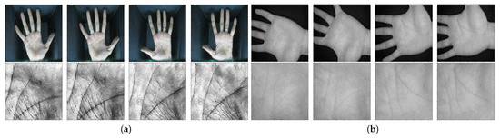 The IIT Delhi (IITD) Touchless Palmprint Dataset [23], collected by the Indian Institute of Technology Delhi, provides images from the left and right hands of more than 230 volunteers in the age group between 14–57 years. Images in the database were collected with a simple touchless imaging setup in an indoor environment and with a circular fluorescent illumination around the camera lens. A total of 2601 color hand images from 460 palms with 7 samples for each hand of each person were acquired in a single session. The IITD database also provides automatically segmented (i.e., extracted Regions-Of-Interests—ROIs) and normalized images with the size of pixels and at least 5 samples for each of the two hands. Some typical example images from the IITD dataset from the left and right palmprints with their corresponding ROIs are shown in Figure 7a.