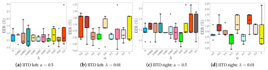 Next, we report qualitative results with respect to the attention mechanism integrated within the proposed Two-path architecture. As discussed earlier (in Section 3.4), the so called channel-wise attention pooling mechanism is a trainable attention operation which offers a straight-forward way of exploring the importance of each image part through the learned feature vector of weights. This feature vector is then converted to a vector of probabilities by using the softmax activation function. To generate interpretable results, we transform the learned vector of probabilities into heatmaps and then superimpose the computed heatmaps over the palmprint images. In Figure 15a,b some qualitative evaluations for the IITD and CASIA datasets are shown, respectively. We can see how the attention mechanism selects certain image regions that are not only locally important but are also beneficial for the overall image representation. Note how this procedure is adaptive in nature and selects a different area in each palmprint depending on image characteristics. Additionally, the selected areas are also quite localized due to the use of the softmax function in the attention mechanism.