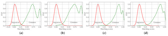 Genuine-impostor score distributions expressed as probability density functions (PDFs) when evaluating on different palmprints: (a) IITD left palmprints, (b) IITD right palmprints, (c) CASIA left palmprints and (d) CASIA right palmprints.