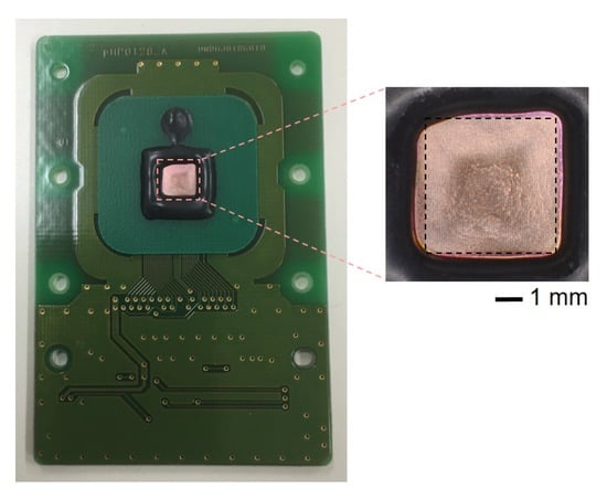 Figure 4 shows the optical microscopic images of a redox-type label-free ATP image sensor and enzyme membrane formed on the sensor array. As can be seen in Figure 4, it was confirmed that the enzyme membrane was formed on the sensing region. The membrane thickness was approximately 1 µm.